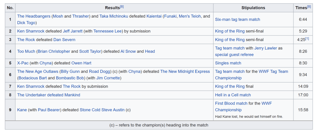 The finals of the King of the Ring gave us Ken Shamrock vs. The Rock. Shamrock defeated Jeff Jarrett via submission to make to the finals, while The Rock had to get past Dan Severn to make it to the finals. Rock and Shamrock by this time had great chemistry in the ring. After multiple tag matches against each other, battling for the Intercontinental title, and the chair shot heard around the world(the way the chair shot was delivered was Shamrock’s Idea.), the 2 would meet again to be crowned as the King of the Ring. After 14 minutes of a hard hitting, back and forth match, Shamrock was able to lock in his ankle lock for the victory. Shamrock would go on to have reigns as Intercontinental and Tag Team champion after winning this tournament.